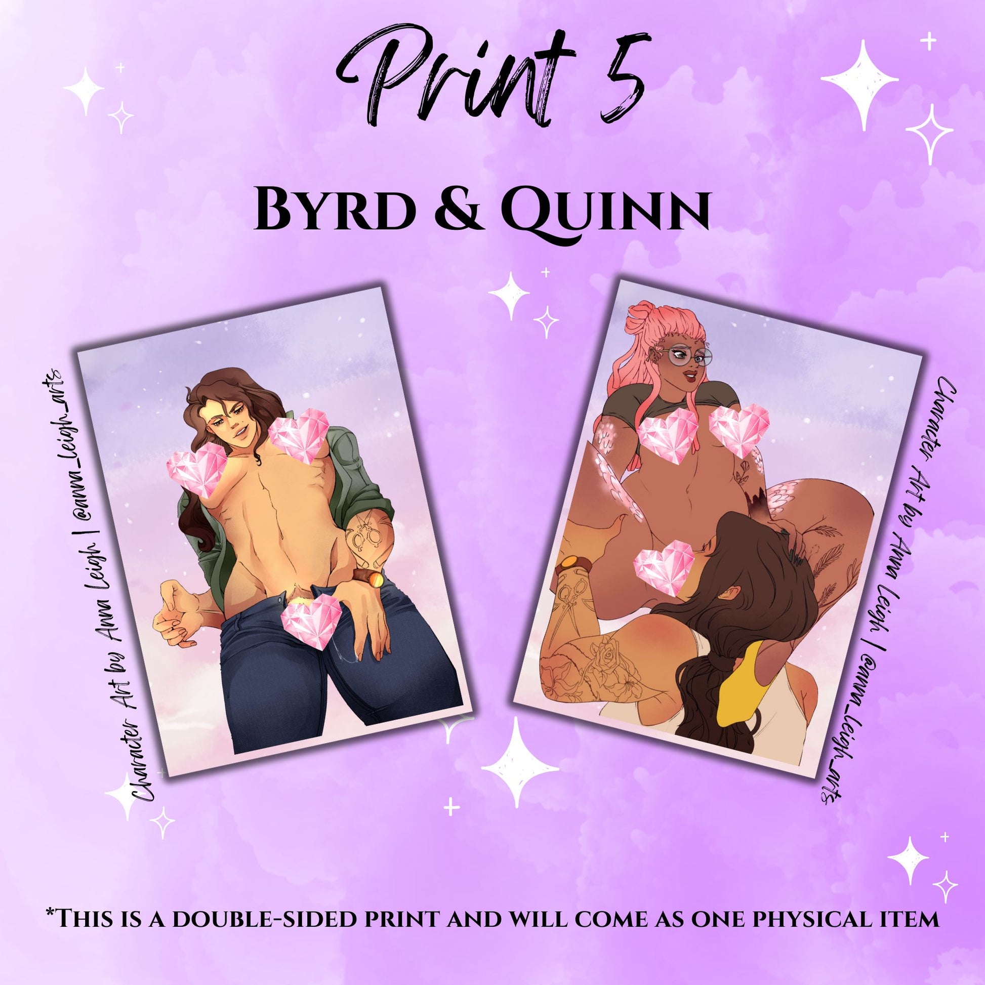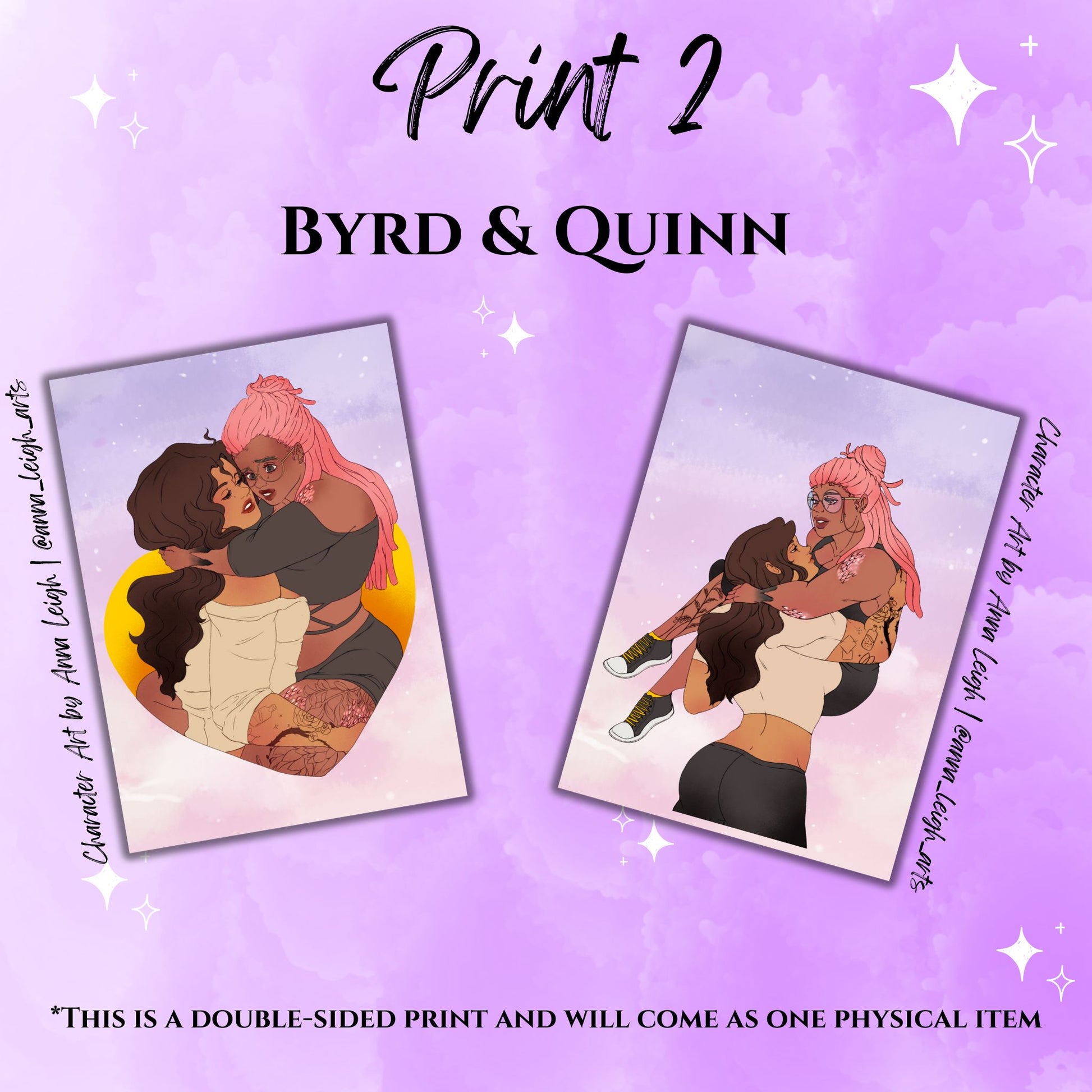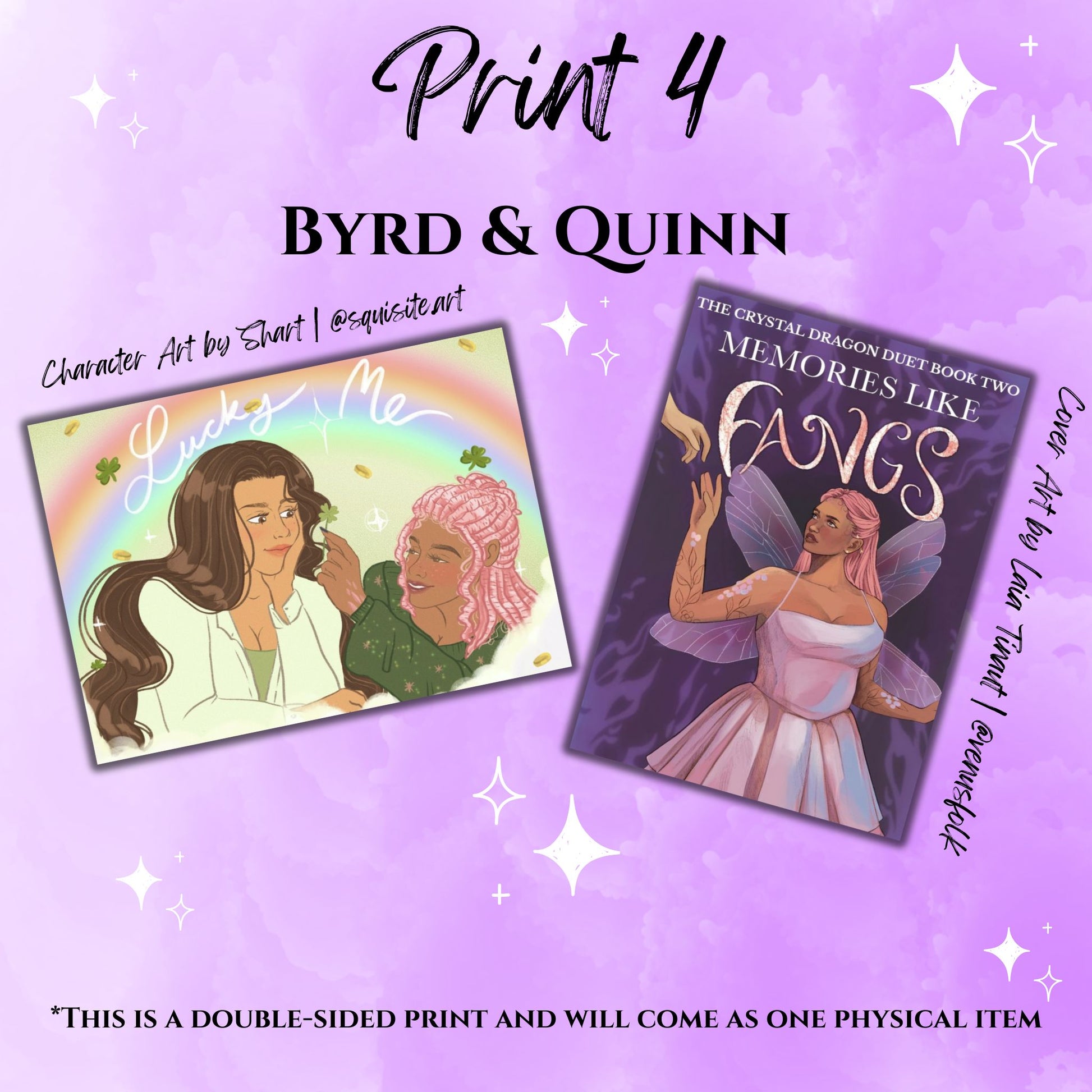 - 4 (OR 5 if you get an NSFW print) 5x7in DOUBLE-SIDED art prints featuring Byrd, Quinn, and the Memories Like Fangs Cover